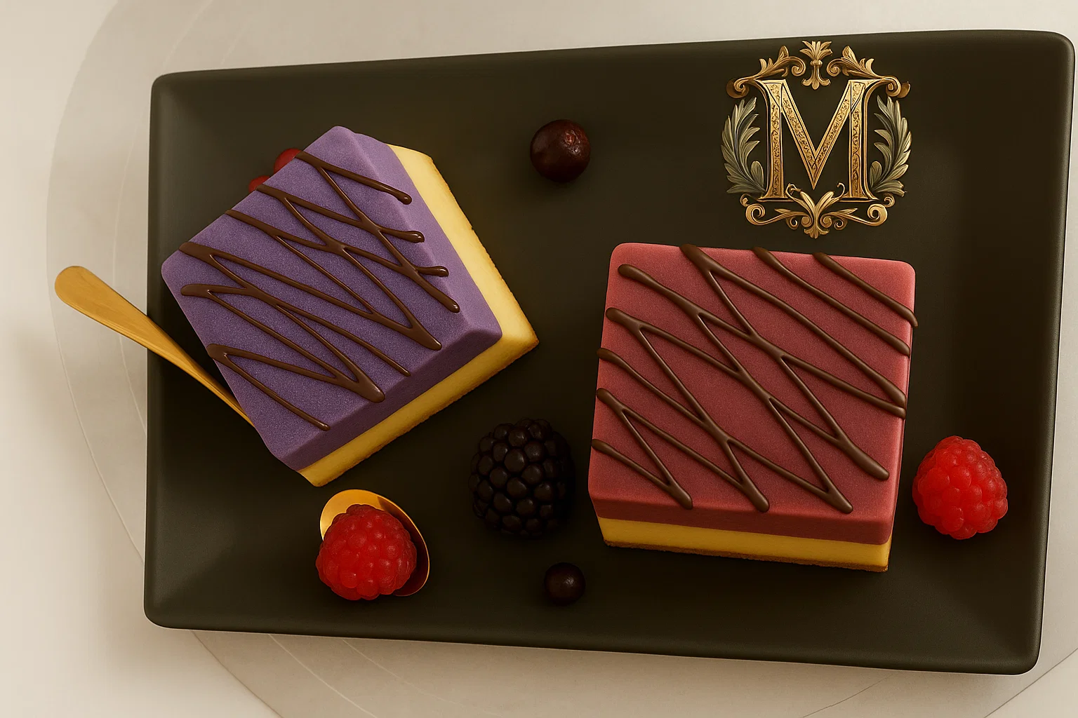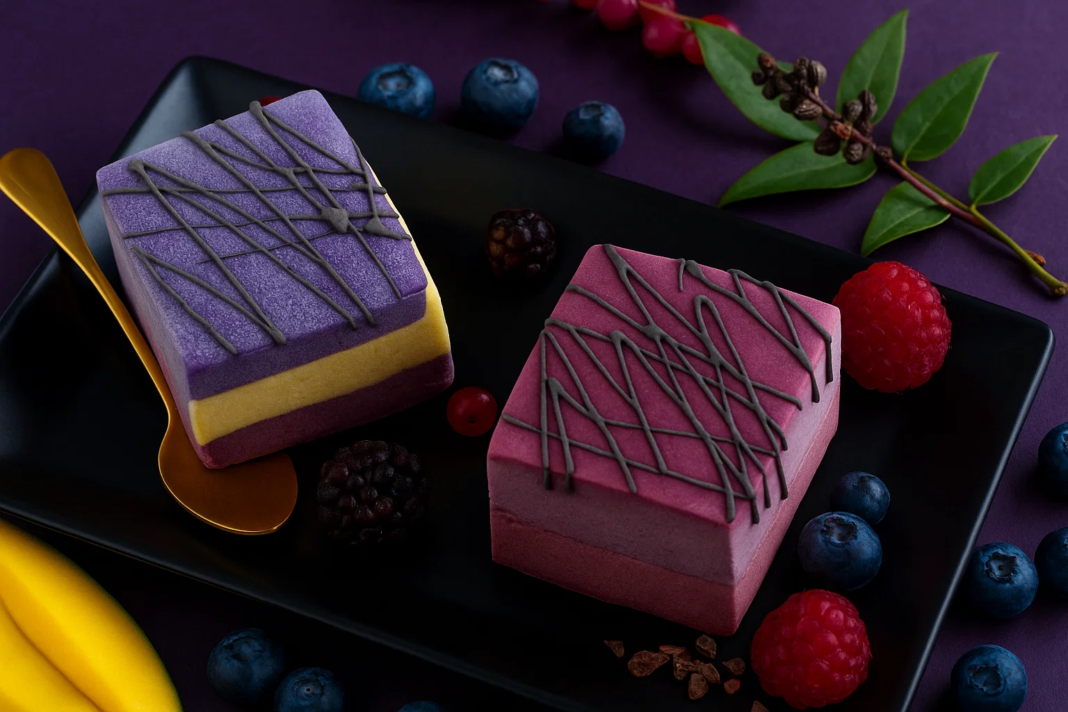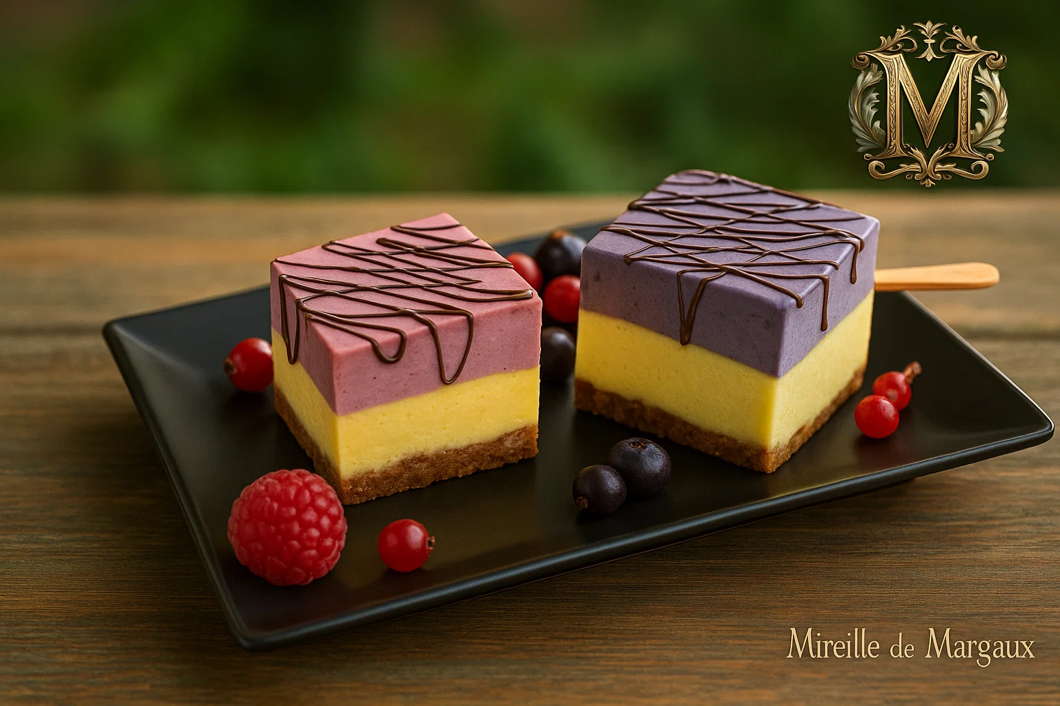 Duo Fruitée este o prăjitură raw vegană cu mousse tropical și fructe de pădure, creată artizanal în atelierul Mireille de Margaux. Are două straturi savuroase: mousse din mango, caju, afine sau zmeură, pe un blat crud cu nuci și curmale. 💜💛