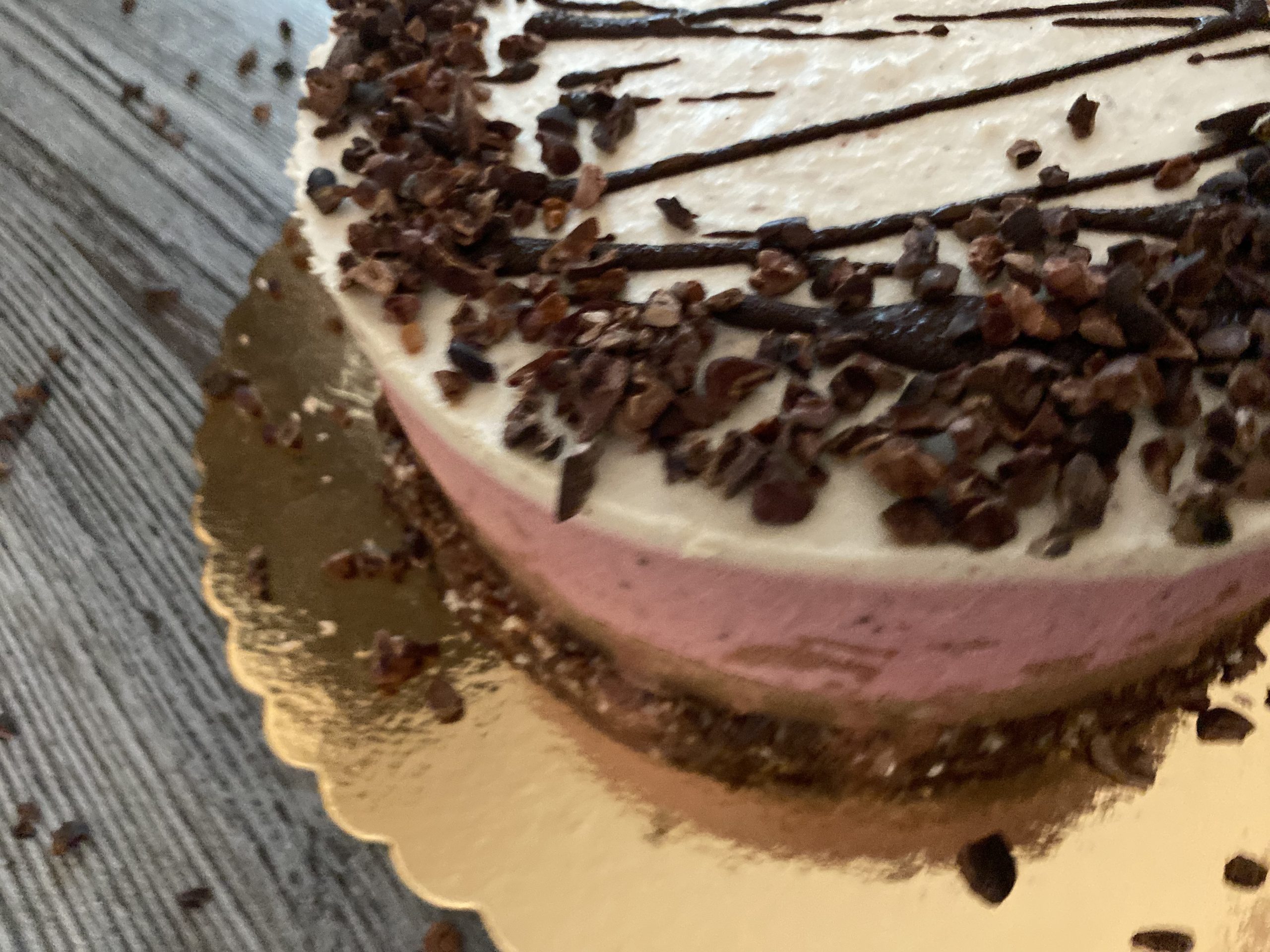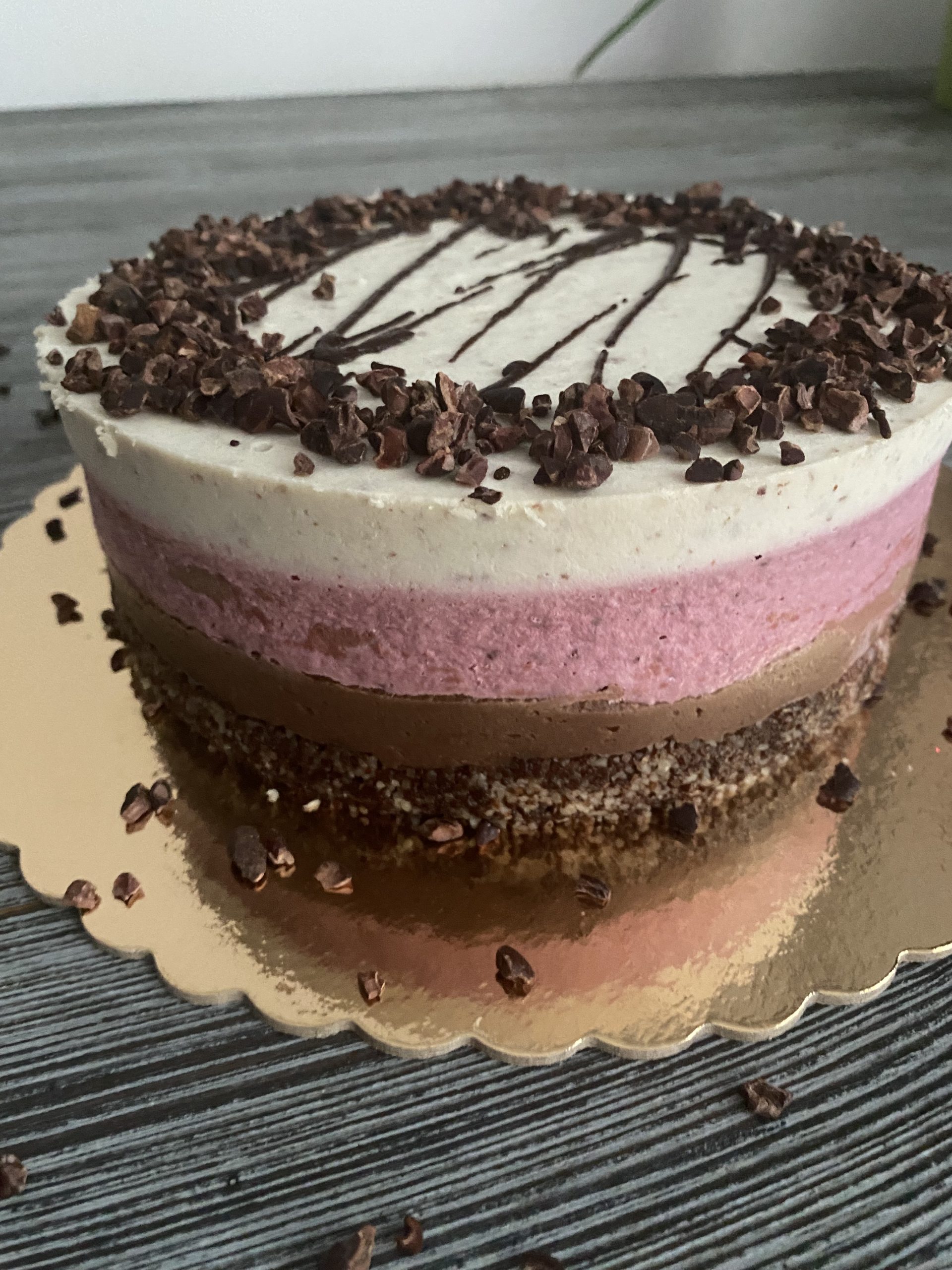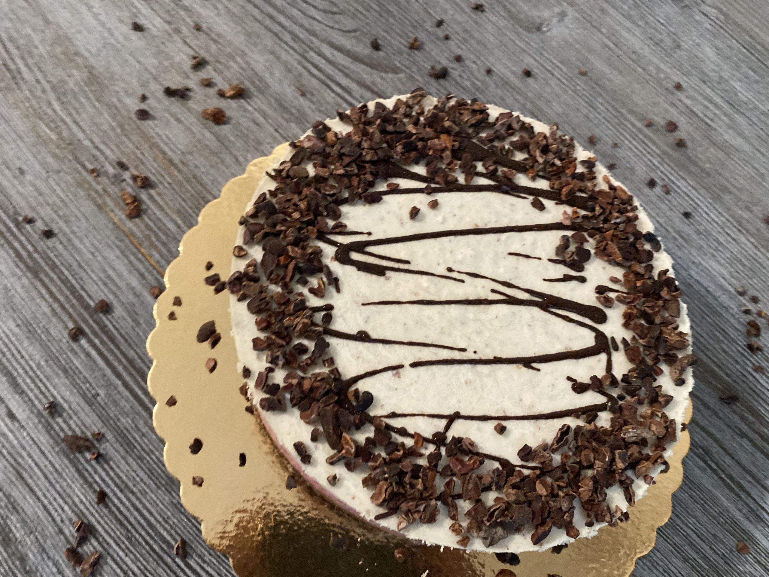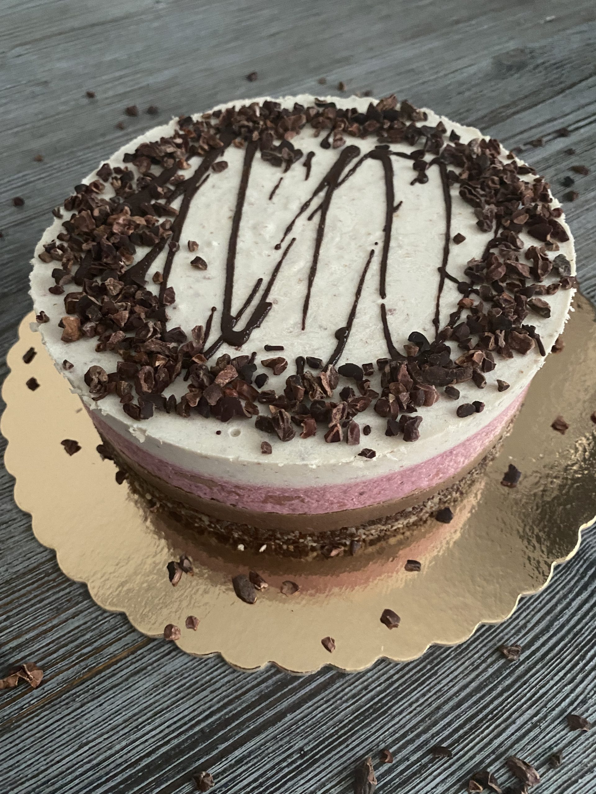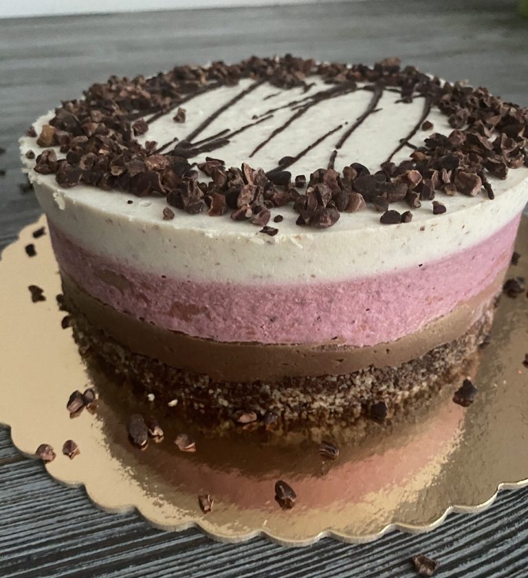 Fiecare tort este compus din straturi atent lucrate. Avem o crustă densă de ciocolată raw, urmată de o cremă catifelată din cacao. Deasupra vin mousse-ul de căpșuni și o cremă delicată de vanilie. Toppingul din cacao nibs oferă textură și echilibru.