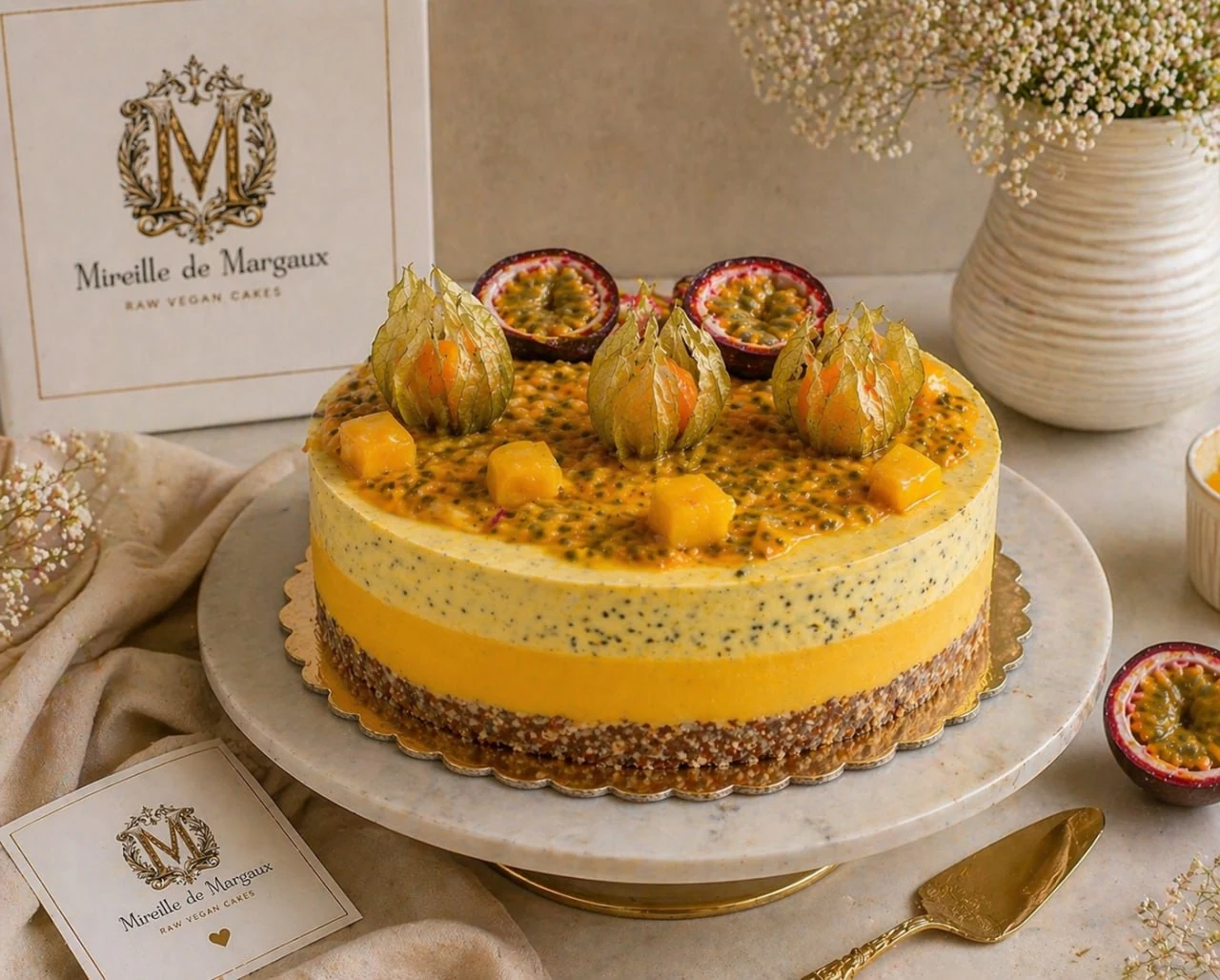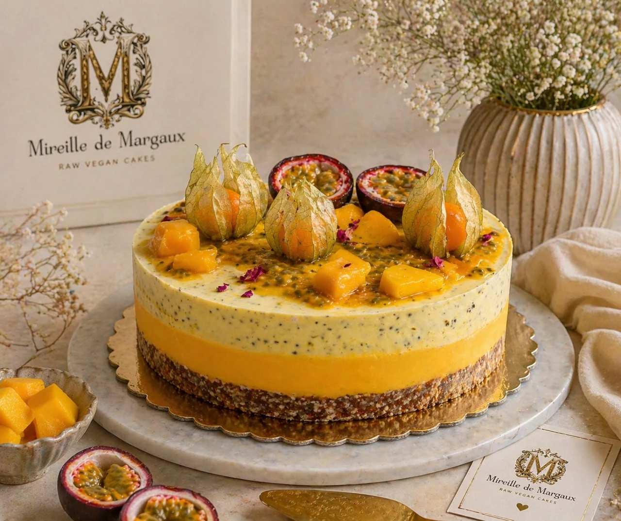 Tort Raw Vegan Mango si Fructul Pasiunii, facut manual in atelierul Mireille de Margaux din Cluj, cu gust tropical, luminos si elegant. Are un blat din migdale, alune de padure si curmale, urmat de doua straturi cremoase: unul intens de mango si unul parfumat cu fructul pasiunii si fresh de portocale.