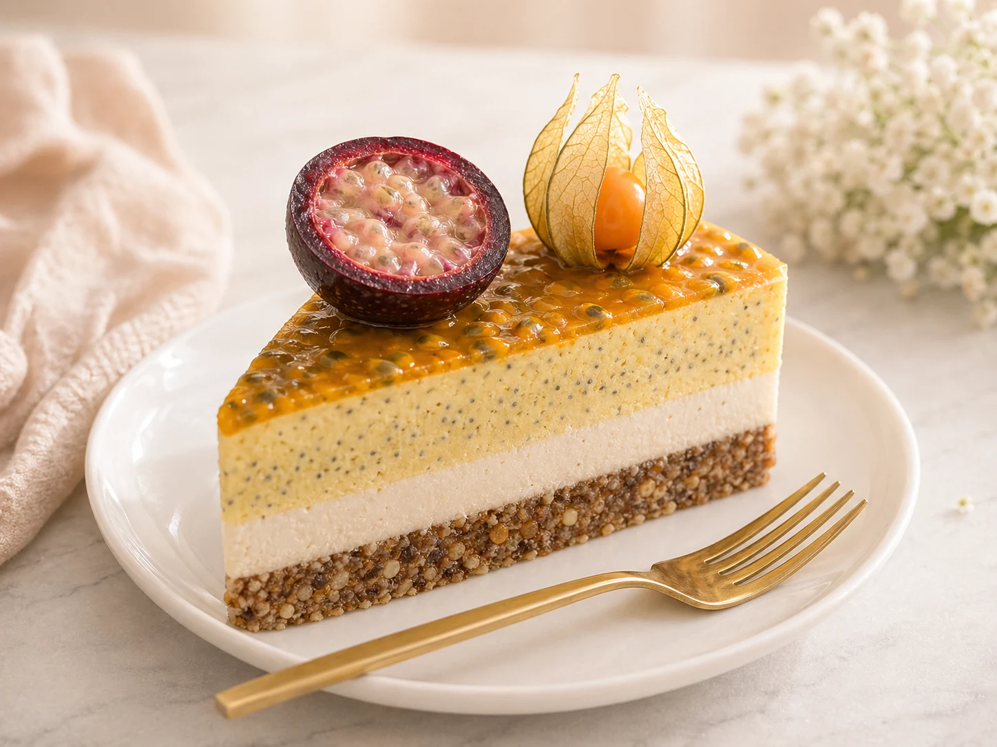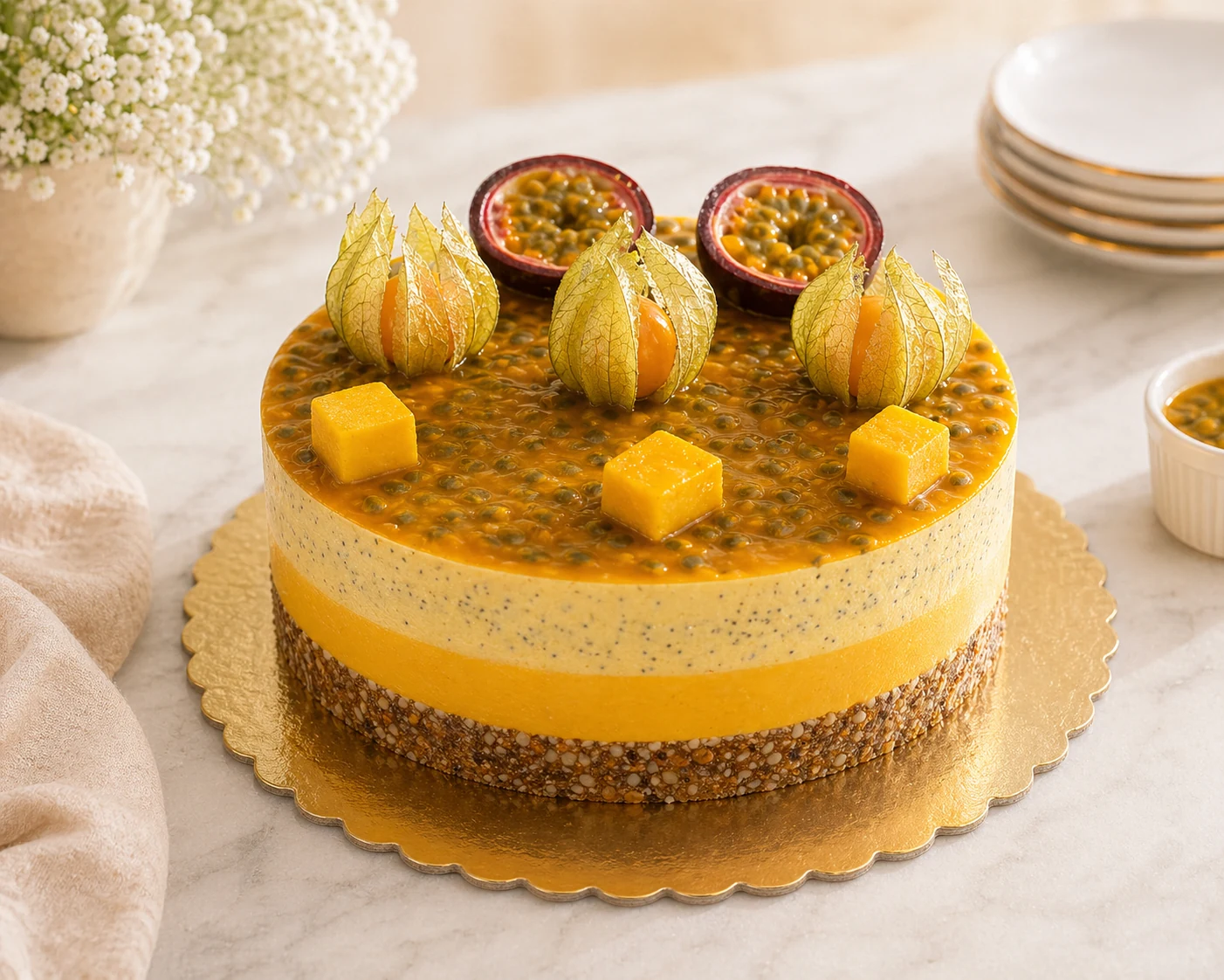 Este genul de tort care se simte fresh si echilibrat: mango-ul vine cu dulceata naturala, fructul pasiunii aduce nota exotica usor acidulata, iar portocala rotunjeste totul intr-un final curat si rafinat.